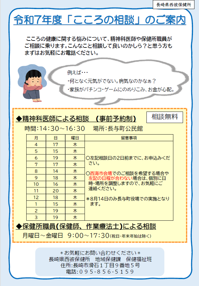 長崎県西彼保健所では、こころの健康、思春期の相談、ひきこもりなど精神保健に関する相談について、医師、保健師、作業療法士、社会福祉職が相談をお受けします。お早めに相談されることが解決への一歩となりますので、お気軽にご相談ください。