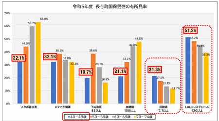 下の表は、令和5年度の長与町国保に加入されている男性の健診結果の年代別有所見率のグラフです。グラフの示す通り、「LDLコレステロール」「尿酸」について、40代男性で一番有所見率が高いと言えます。20代、30代だからと言って安心はできない状態であることが推測されます。